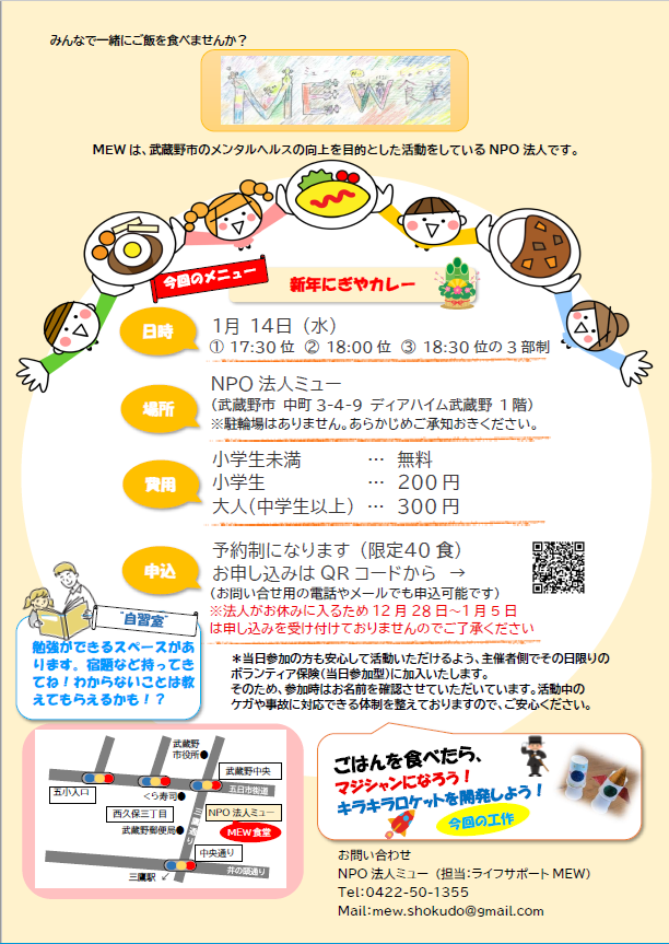 1月14日(水)MEW食堂のお知らせ 2025年12月24日 MEW食堂が1月14日(水)に開催となりました!限定40食となります。お早めにご予約をお願いいたします(QRコード、お電話でご予約できます。詳しくはチラシをご覧ください)。 ※定員数に達し次第、締め切りとさせていただきます。